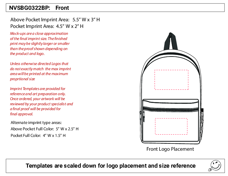 | Product Features | 19" standard durable backpack. Features include: Large 19" cargo area with double zipper pulls Zipper front pocket 1 side mesh pocket Padded shoulder straps Padded Backing Printed in the USA |